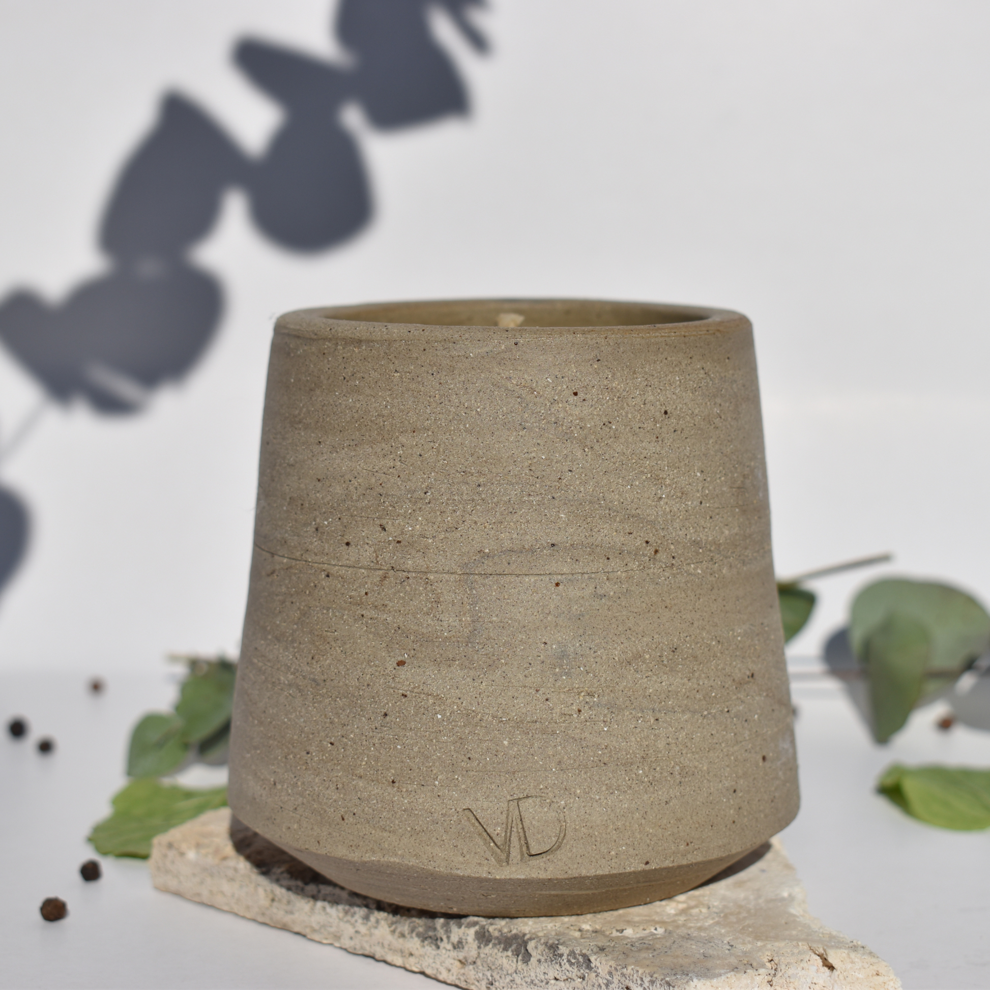 Créée en collaboration avec une céramiste belge, chaque bougie est coulée dans un écrin façonné à la main selon la technique de la terre mêlée.